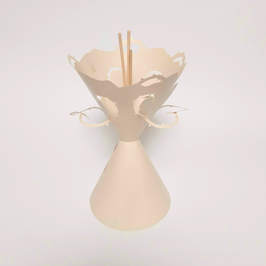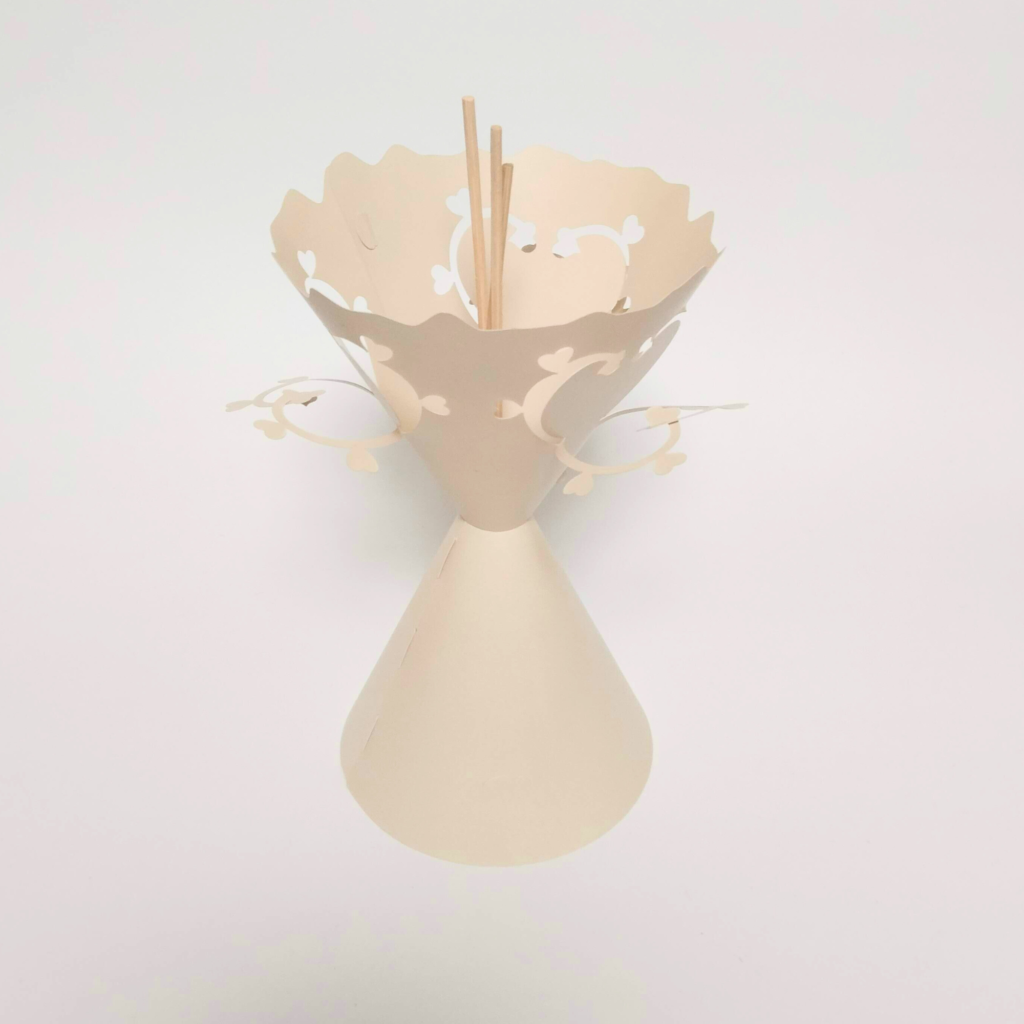 Product 空間を彩るデザイン ベロニカは意匠権登録商品です 心紗(しんしゃ) ベージュ 心紗(しんしゃ) ブラウン 凛悠(りんゆう) ベージュ 凛悠(りんゆう) ブラウン 光沫(こうまつ) ベージュ 光沫(こうまつ) ブラウン オンラインショップで販売している商品は、アートフラワー、スティック、そしてフレグランスオイルがセットとなっております。お届け時に、すぐに飾ってお楽しみいただける状態でお送りいたします。詳しくはオンラインショップをご覧ください。 オンラインショップ 素材について ― ユポ紙の特性とVELONICAのかたち VELONICAのプロダクトには、ユポ紙と呼ばれる特殊な素材を使用しています。ユポ紙は、一般的な紙とは異なり、合成樹脂を原料とした“紙のようで紙ではない”素材です。この素材の大きな特徴は、しなやかさと適度な張りを併せ持ち、曲げても形を保とうとする性質にあります。そのため、平面的になりがちな紙素材とは違い、自然な立体感や奥行きのあるデザイン表現が可能になりました。また、耐水性や耐久性にも優れており、時間の経過や環境の変化に左右されにくいのも特長のひとつ。繊細な見た目でありながら、長く美しさを保てる素材だからこそ、VELONICAのプロダクトに採用しています。手に取ったときに感じる、紙とも布とも違う独特の質感。その素材感そのものが、VELONICAの静かな存在感と、空間に寄り添う美しさを形づくっています。